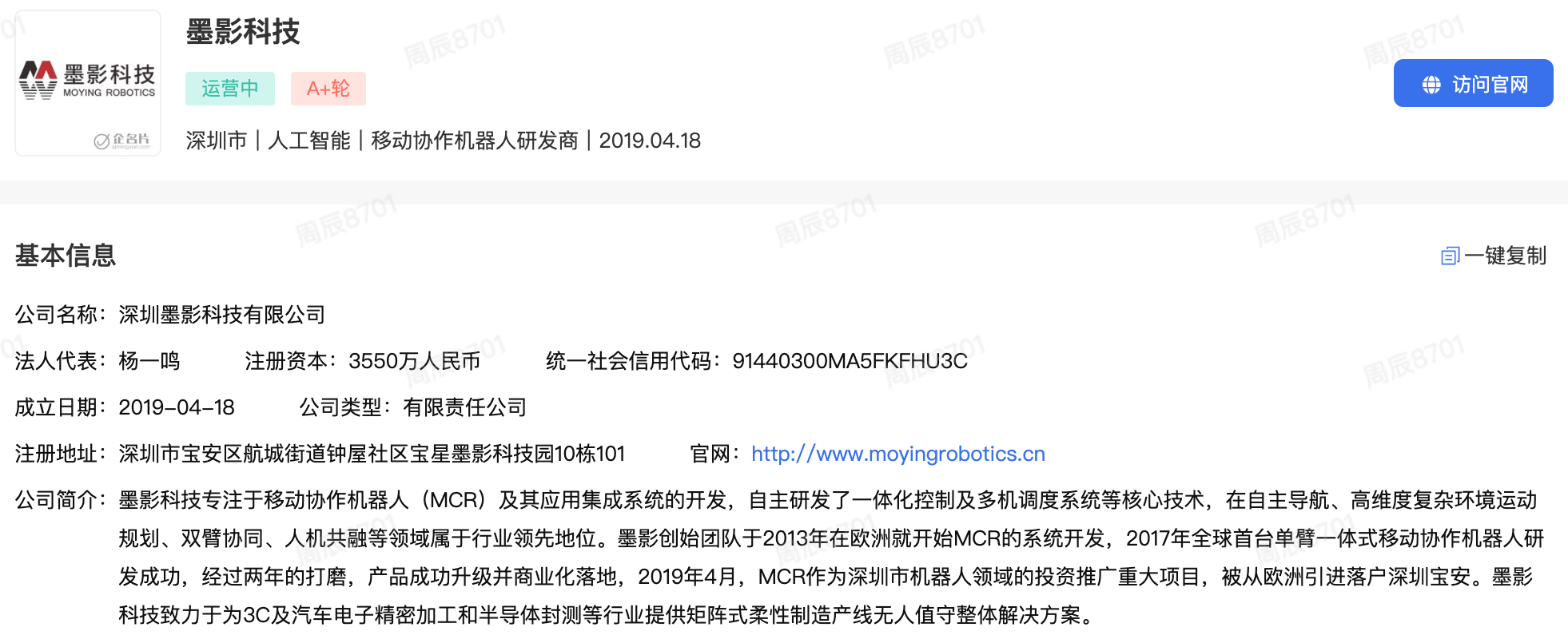 墨影创始团队于2013年在欧洲就开始MCR的系统开发,2017年全球首台单臂一体式移动协作机器人研发成功,经过两年的打磨,产品成功升级并商业化落地,2019年4月,MCR作为深圳市机器人领域的投资推广重大项目,被从欧洲引进落户深圳宝安。墨影科技致力于为3C及汽车电子精密加工和半导体封测等行业提供矩阵式柔性制造产线无人值守整体解决方案。